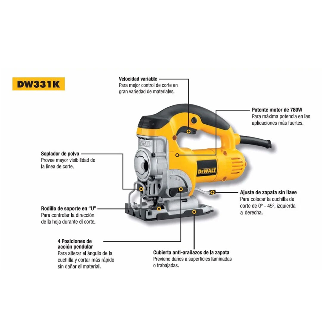 La sierra caladora DEWALT DW331 (comercializada habitualmente como DW331K, incluyendo un estuche) es una herramienta industrial con cable de 700 W y velocidad variable que destaca por su potencia y durabilidad.