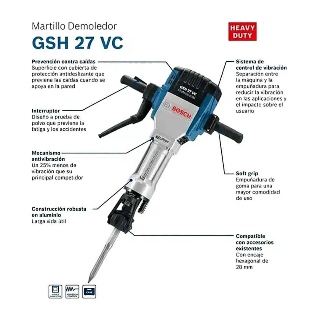 El martillo demoledor Bosch GSH 27 VC Professional es el equipo de 110V más potente y robusto del mercado, diseñado específicamente para operaciones extremas de demolición de suelos y cimientos. Equipado con un motor de 2.000 W, ofrece una fuerza de impacto inigualable de 62 Julios, garantizando un rendimiento de arranque de material superior a 10 toneladas por día. Este gigante de la demolición destaca por su construcción extremadamente resistente y componentes metálicos de alta calidad que aseguran una vida útil prolongada. A pesar de su inmensa potencia, el sistema Vibration Control reduce las vibraciones a niveles manejables (solo 8 m/s²), permitiendo periodos de uso más largos y cómodos.