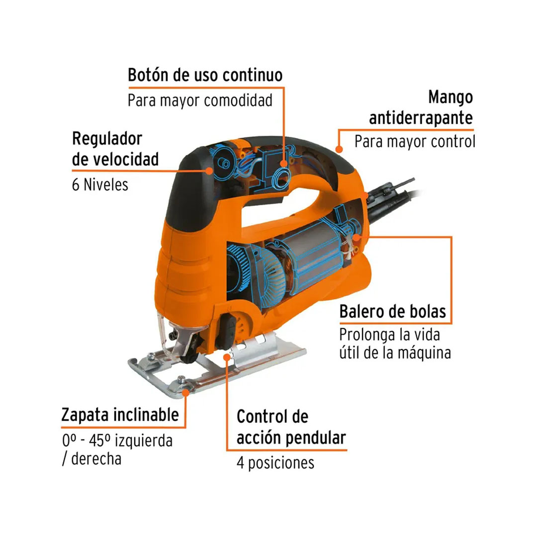 Potencia 550W, velocidad variable, alimentacion electrica, Uso profesional, Motor montado sobre balero de bolas para mayor durabilidad, accion pendular de 3 o 4 niveles para cortes rapidos y finos.